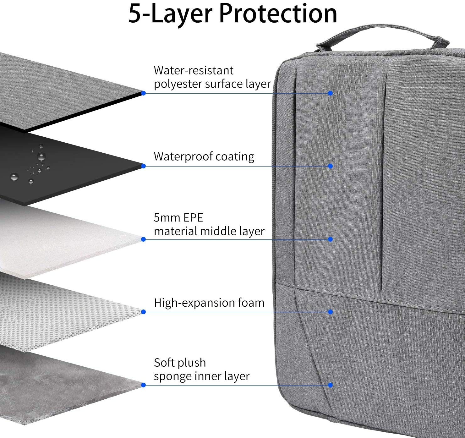 - Shockproof – Multiple Layers Protection, polyester foam padding layer and nylon fabric lining for bump and shock absorption, protect your computer from accidental scratches.