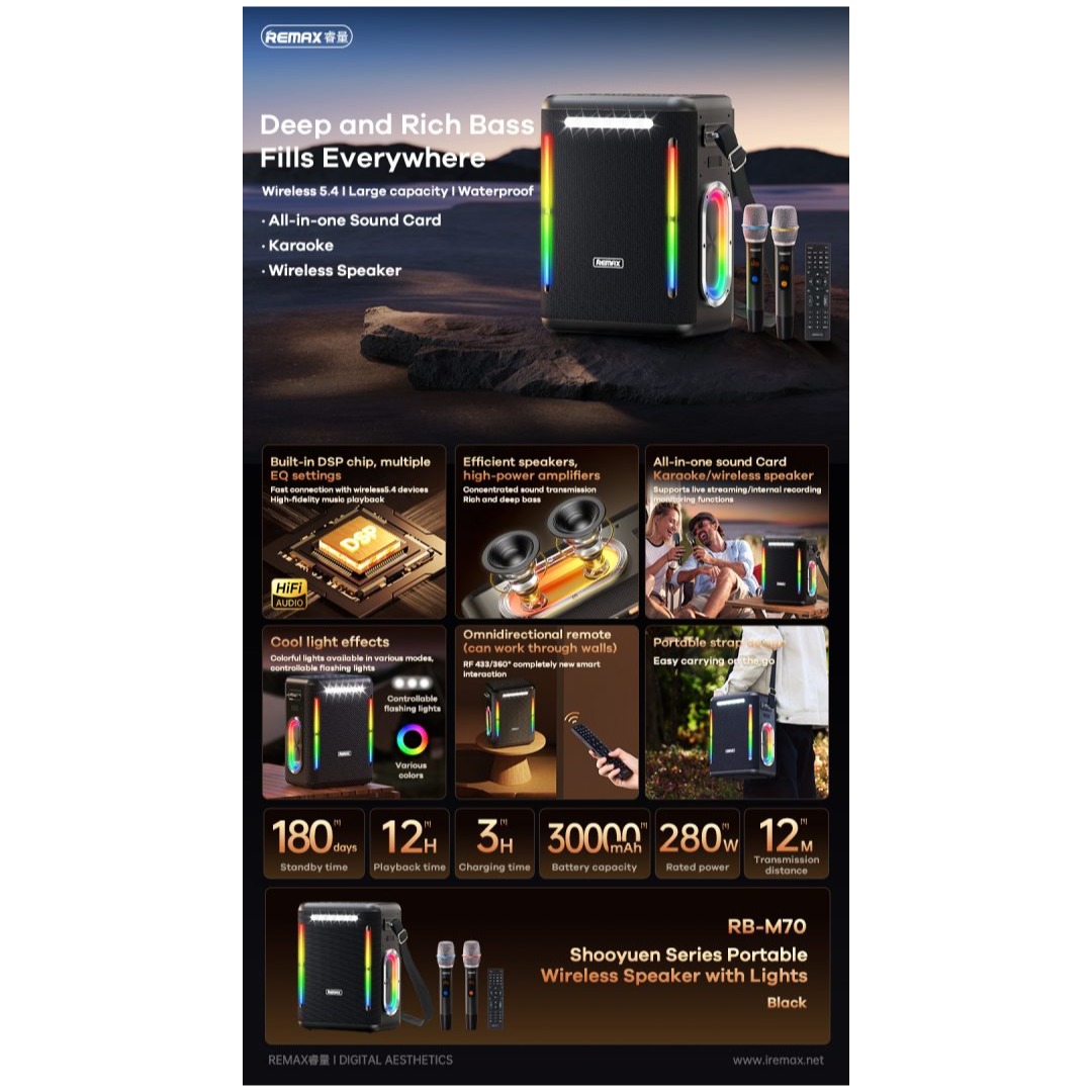 2 . Sound Card/Karaoke/wireless speaker, all in one, built-in DSP, multiple EQ settings, support internal monitoring/recording/live streaming function, 433/360° omnidirectional remote control (can work through walls)